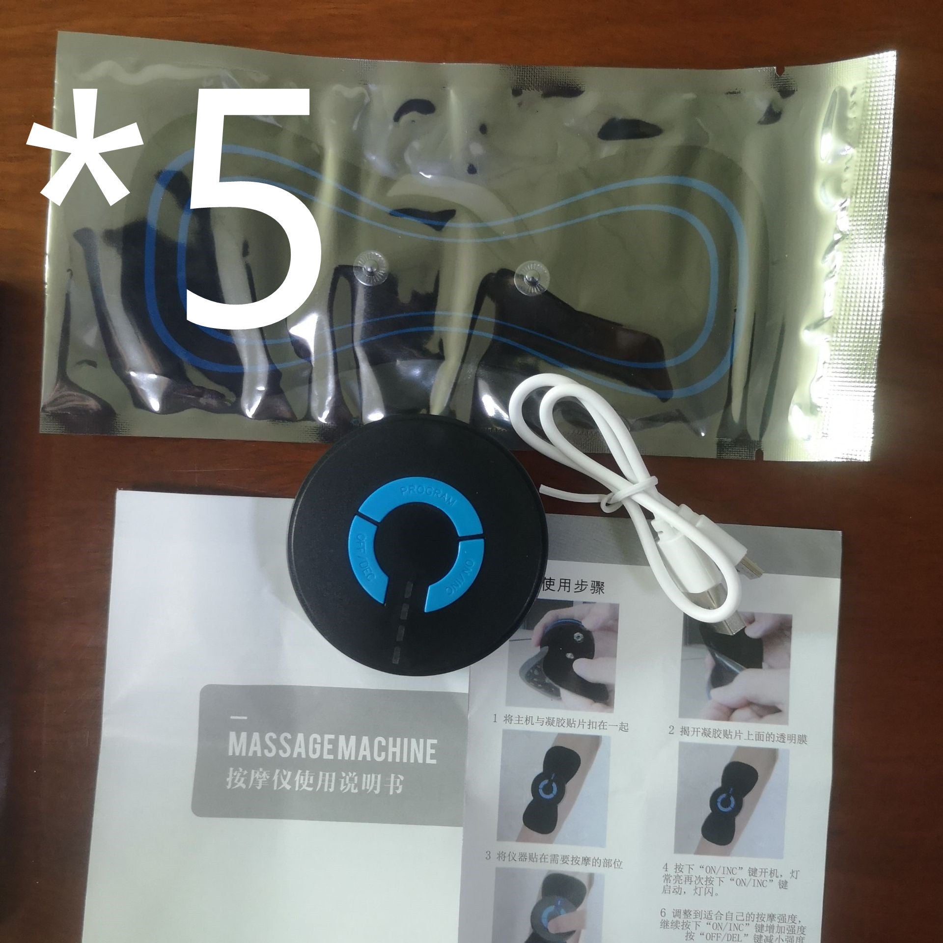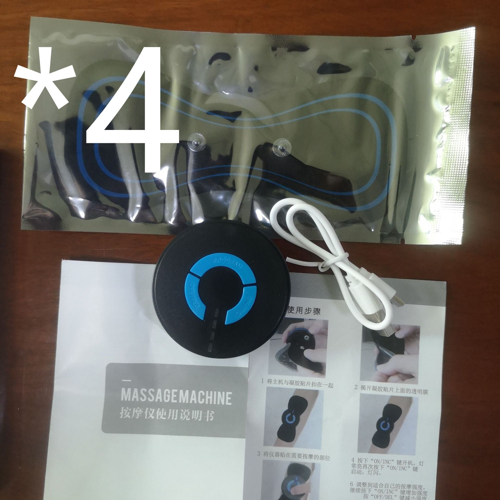 The charging product includes: host x 1pc+USB charging cable x 1pc+massage patch x 1pc+instruction manual x 1pc+color box x 1pc